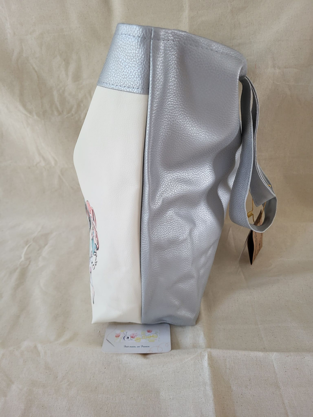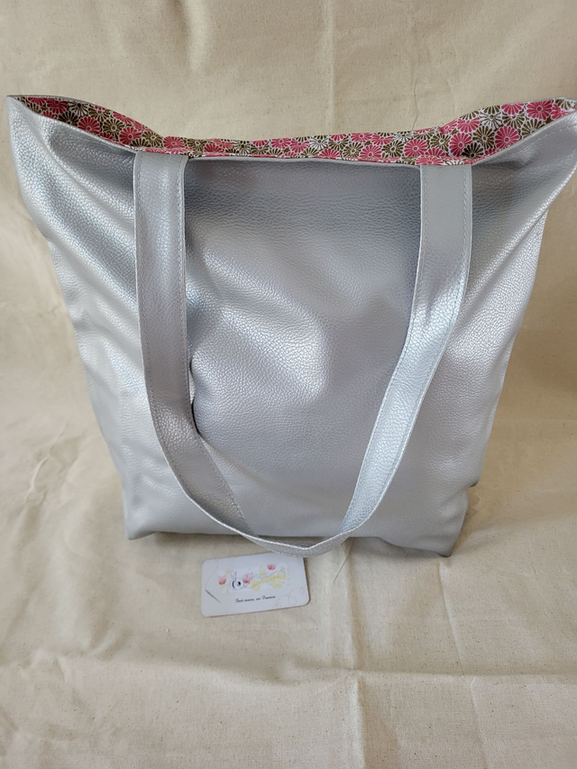 L'envers est en simili cuir gris argenté.