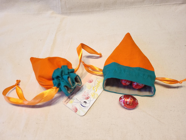Tout en coton et doublée, elle contient une dizaine de chocolat. Elle se ferme grâce aux petits rubans assortis.